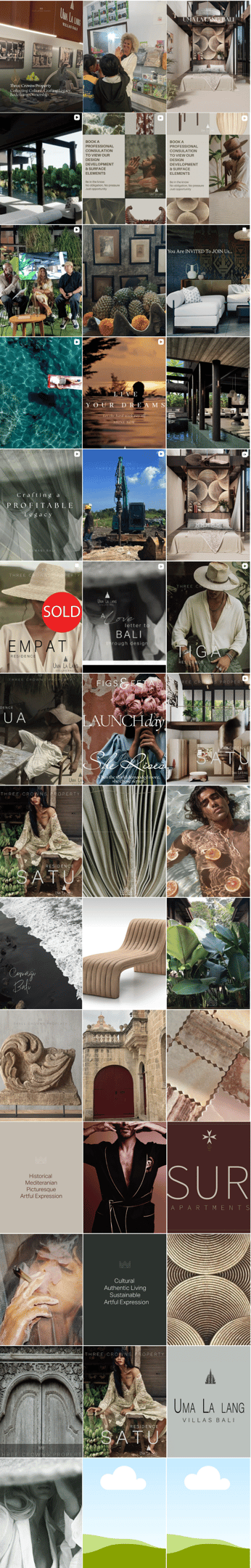 I rebuilt the social media Three Crowns Property ecosystem from the ground up, establishing a cohesive brand identity, consistent visual direction, and clear content framework. Developed content pillars centered around art, culture, and lifestyle storytelling, aligning each property with its local cultural narrative. Crafted localized copywriting strategies by incorporating native language elements (e.g., Balinese, Maltese/European tone) to enhance authenticity and audience connection. Focused on storytelling-driven content to communicate brand values, educate audiences, and build emotional engagement beyond transactional property marketing. Ensured consistency across all platforms while maintaining a strong, recognizable brand voice and visual identity.